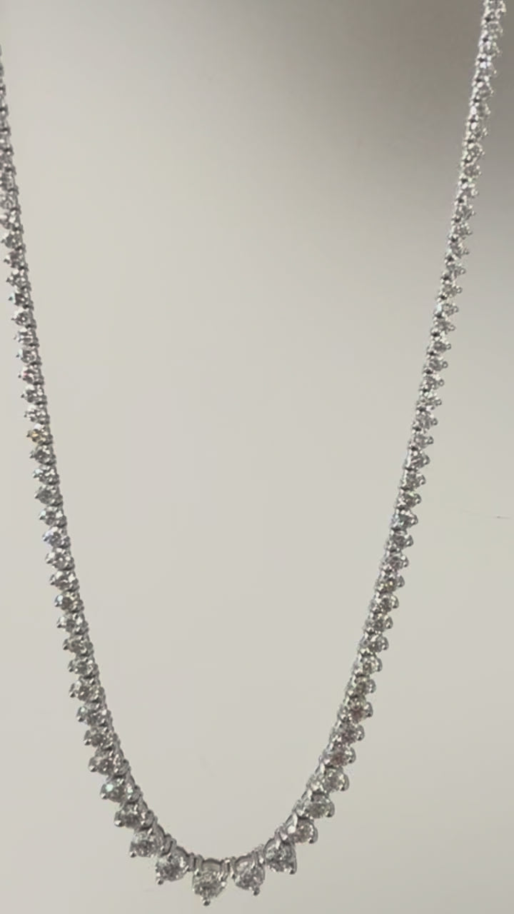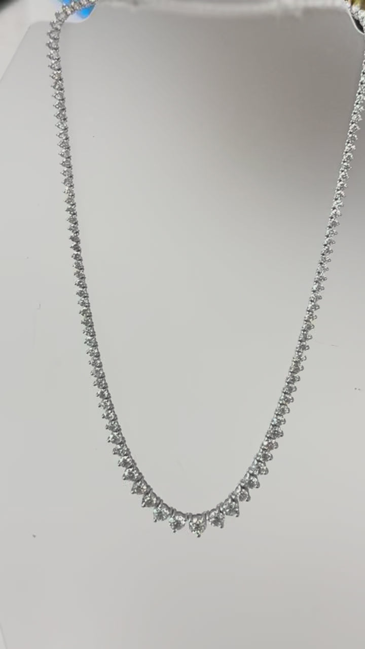 A breathtaking statement piece — this exquisite graduated diamond tennis necklace features 19.57 carats of 100% natural round brilliant-cut diamonds, each meticulously set in a three-prong 14K white gold setting for maximum brilliance and sparkle. The design transitions gracefully from smaller stones at the clasp to larger center diamonds, creating a sophisticated graduated effect that flatters every neckline. This necklace includes an adjustable extension, allowing it to be worn at 16 inches or 18 inches, offering versatility for any occasion. A true luxury essential that blends timeless elegance with everyday wearability — perfect for collectors and connoisseurs of fine diamond jewelry.